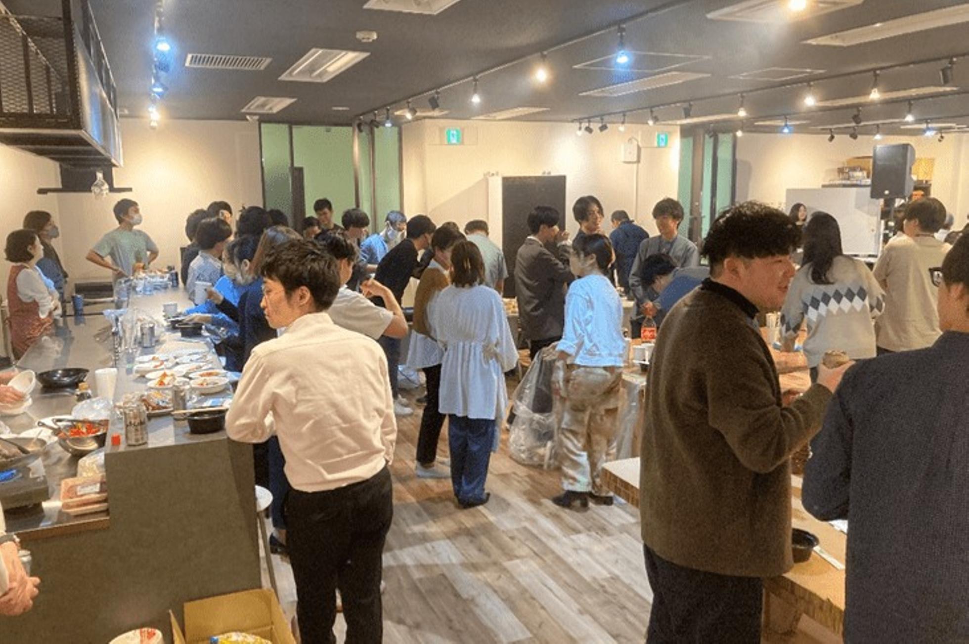 オフィスB1は、広々としたコミュニケーションスペース。キッチンを囲んで自然と会話が生まれ、研修や社内イベントの場としても活用。ビリヤードや卓球台もあり、サークル活動も行われています。