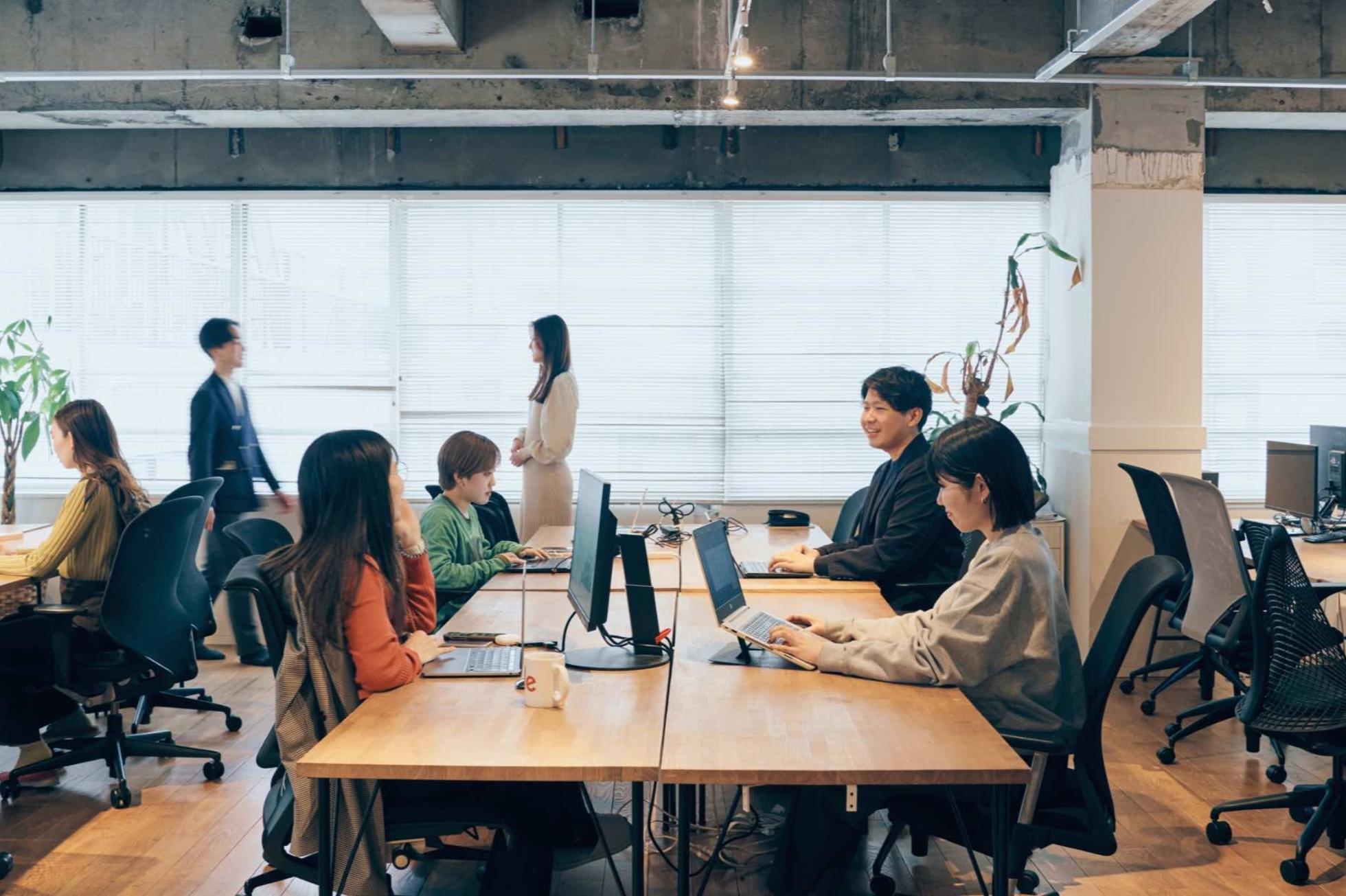 「goodoffice品川」元医療施設を一棟オフィスにリノベーションした物件です。私たちのオフィスや、ホールディングス企業のオフィスもこちらにあります。コンクリートをあらわにしたソリッドな質感と、無垢材のあたたかみが共存するユニークな内観。(画像:goodoffice品川)
