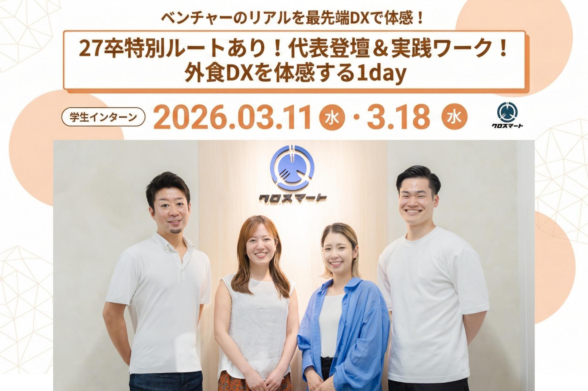 「外食のチカラで、日本中を強くやさしく豊かに」 私たちは25兆円という巨大な市場規模を持ちながら、今なおアナログな課題が残る「外食産業」のDXに挑むスタートアップです。現在は、業界の新たなスタンダードを確立していく、非常にエキサイティングな拡大期にあります。 今回の1dayインターンシップの目的は、次世代のクロスマートを共に創り上げる「未来のリーダー」との出会いです! ・自分の実力がどこまで通用するのか試したい ・圧倒的な熱量を持つ経営陣や先輩と本気で議論したい ・泥臭くても、数字という「成果」で自分を証明したい そんな野心を持つ皆さんに、私たちの事業の醍醐味と、裁量を持って働くことの「厳しさと楽しさ」を肌で感じてほしいと考えています。 この出会いをきっかけに、業界の未来を塗り替える「最高のチーム」の一員となる方とお会いできることを心から楽しみにしています!