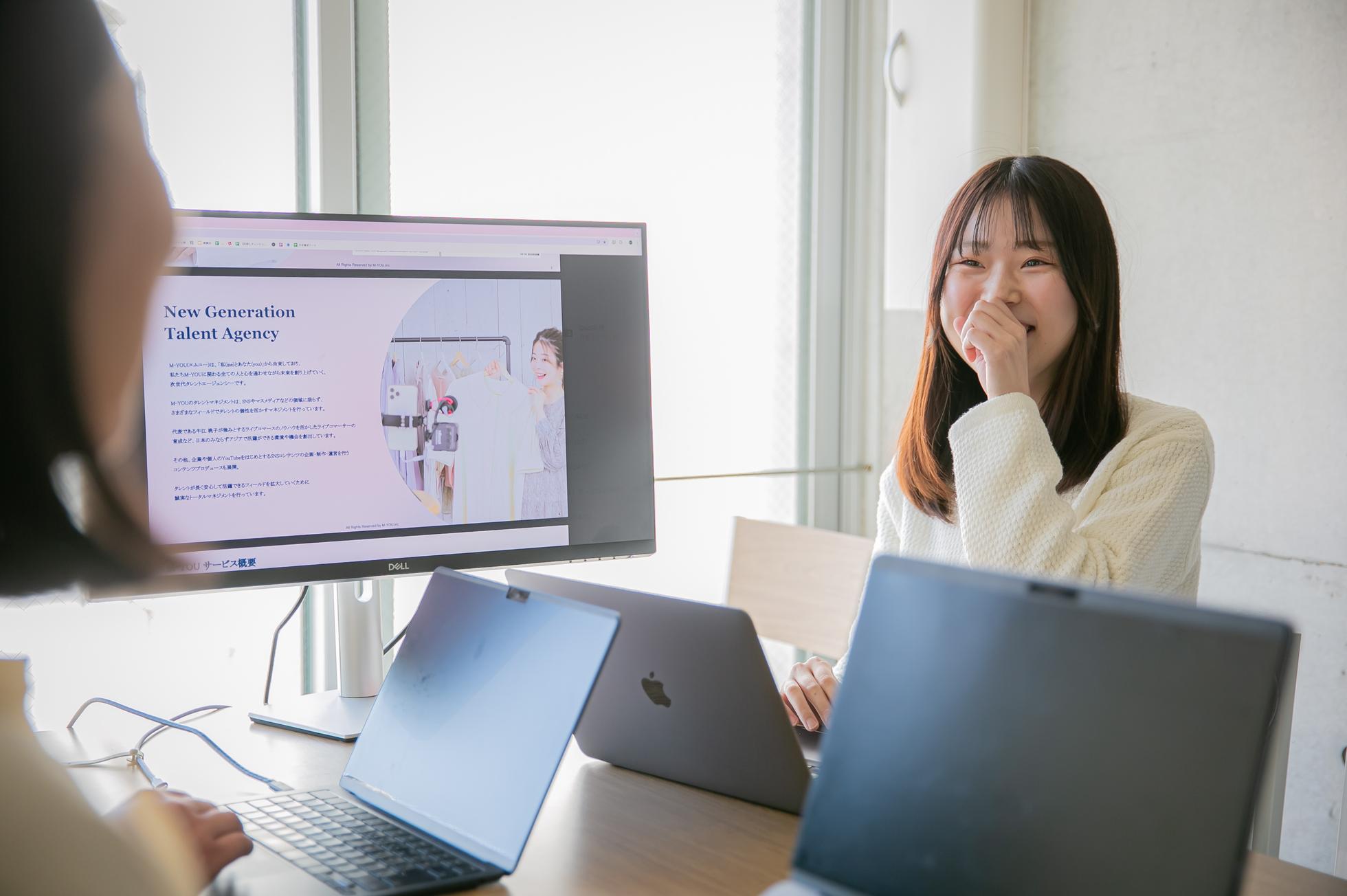 M-YOU株式会社は関わる全ての人と心を通わせながら未来を創り上げていく、タレントエージェンシーです。 【タレントマネジメント事業】 SNSやマスメディアなど、領域に限らずタレント自身の個性を活かすタレントのマネジメントを行う他、ライブコマーサーの育成など、タレントが日本のみならずアジアで活躍できる環境や機会を創出します。 タレントが長く安心して活躍できるフィールドを拡大していくために誠実なトータルマネジメントを行っています。 【コンテンツプロデュース事業】 企業や個人のYouTubeをはじめSNSコンテンツのブランディング・企画・制作・運営・分析まで横断的にサポートします。 蓄積したクリエイティブノウハウと分析力を活かし、パートナーが抱える課題に寄り添い幅広い手段を用いてコンテンツのプロデュースを行います。 【実績】 国内にとどまらず、海外のクライアント様が多くいらっしゃいます。近年は、韓国や中国のクライアント様が増えつつあるため、タレント事業に加え、語学を活かせる仕事に就きたいと考える方にとって、面白い環境といえます。 【今後の展望】 商品の魅力を押し出せるプロデュース力の高いタレントを育てていきたいと考えています。 タレント生命は儚いもので、一瞬のブレイクで終わってしまう方も少なくありません。当社の所属タレントには、長きにわたって活躍してほしいという想いがあります。そこで、お仕事のサポート以外にも、金融教育や生活サポートなども強化していく方針です。