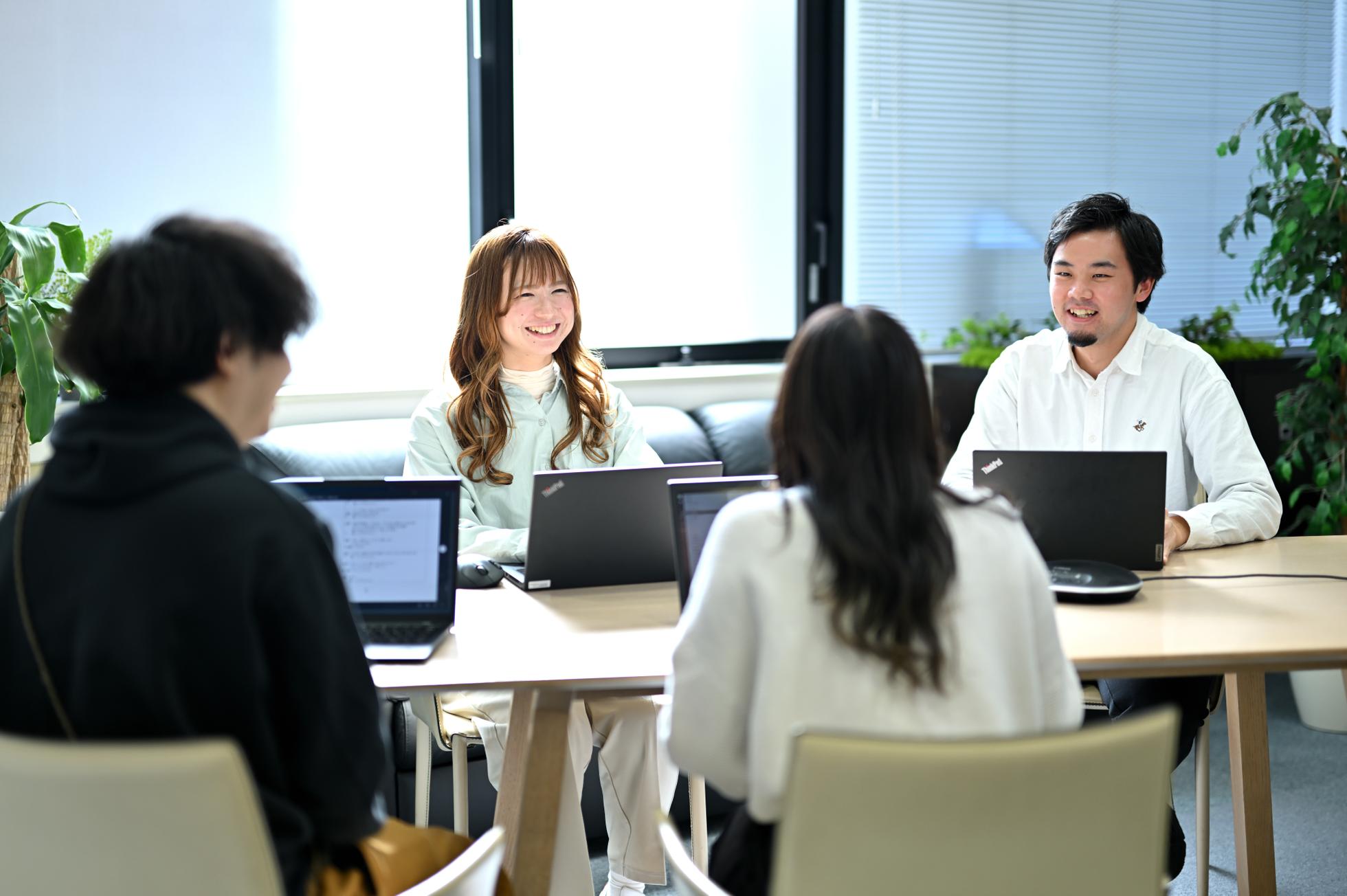 多様な考えを持つ仲間が集まり、互いを認め合ったりディスカッションをしたりしながら、同じ目的に向かって仕事をしています。個人が成長することにより、会社もさらに成長する、という環境にしていきます。