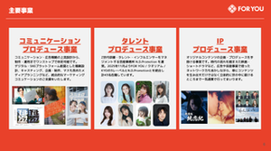 【広告事業|Communication Produce】 デジタル・SNSプラットフォーム前提としたマーケティングコミュニケーション・広告戦略の上流設計から、企画・制作・運用までワンストップで伴走可能です。 マスも含めたメディアプランニングなど、統合的なマーケティングコミュケーションのご支援をいたします。 実績紹介 ▼https://foru.co.jp/works/ 株式会社FOR YOUは2025/10/1に株式会社ContentAgeに社名変更し、広告事業はFOR YOU by ContentAgeとしてカンパニー制を導入しました。 【タレント事業|Talent Produce】 マスメディアとソーシャルで活動する才能をプロデュースする次世代タレント事務所 デジタル戦略を強みとする次世代タレント事務所。 タレント性とインフルエンス力を兼ね備えた才能を、ありたい姿へプロデュースし、再現性のあるマネタイズノウハウにより所属するタレントにとって最高のパートナーであり続けます。 2025年11月よりFOR YOU / クオリアム / KYOの3レーベルとN.D.Promotionとを統合し計43名在籍しています。 実績紹介 ▼https://ndpromotion.co.jp/works/ 【IPプロデュース事業|Talent Produce】 オリジナルコンテンツの企画・プロデュースを手掛ける事業です。時代の流れを踏まえた映画・ショートドラマなど、広告や芸能事業で培ったネットワーク力も活かしながら、単にコンテンツを生み出すだけではなく立体的に世の中に届けるところまで一気通貫で行ってまいります。