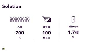 チームラボのソリューション(クライアントワーク)は全てが直接受注のプライム案件であり、これまで手がけたWebサービスでは月間アクティブユーザーは3000万人、リリース済みのスマホアプリでは累計1.7億DL以上(アプリ平均評価4.53)に達しています。近年では、更なる大型案件も新たに多数受注しており、さらに規模を拡大する見込みです。