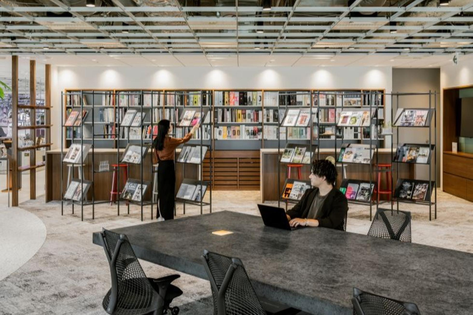 MTG風景 (ATELIER)マテリアルの管理や選定をするエリア。床材や壁紙などのマテリアルを共有する棚を設置しており、一箇所に集めることで効率的な管理ができ、資源の削減を図ることも可能です。