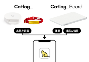 CatlogとCatlog Boardを一緒に使えば、猫様の留守中の行動把握と健康管理がひとつのアプリで完結。Catlog で飲水の様子を、Catlog Boardで排尿の様子をダブルで記録することにより、「多尿」だけでなく「多飲」もあわせて検出します。多飲多尿の状態は、猫様が気をつけるべき病気でも見られやすいため、注意が必要です。健康な時からご使用いただくことで、いつもとの違いに早く気づいてあげることができるかもしれません。