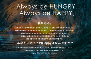 仕事で不幸せになっている人を少しでも減らしたい。そんな想いから弊社は 『はたらくをもっとHappyに』をミッションとして、職場満足度が最も低い業界の一つである歯科業界においてEngagement Revolutionを仕掛けております。 『 あなたにとってのHappyはなんですか? 』 それぞれのHappyの実現に向けたチャレンジが、世の中全体をHappyにしていく。 自分も周りの人も、働く人々みんなもHappyにする。 仕事とは本来誰かを幸せにするためにするものだと捉え、チャレンジしています。