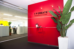 赤を基調としたエントランスと顧客対応スタッフが見通せるエントランスは、関係各社様へ貢献するための情熱と、金融事業に安心を与える透明性を表しています。