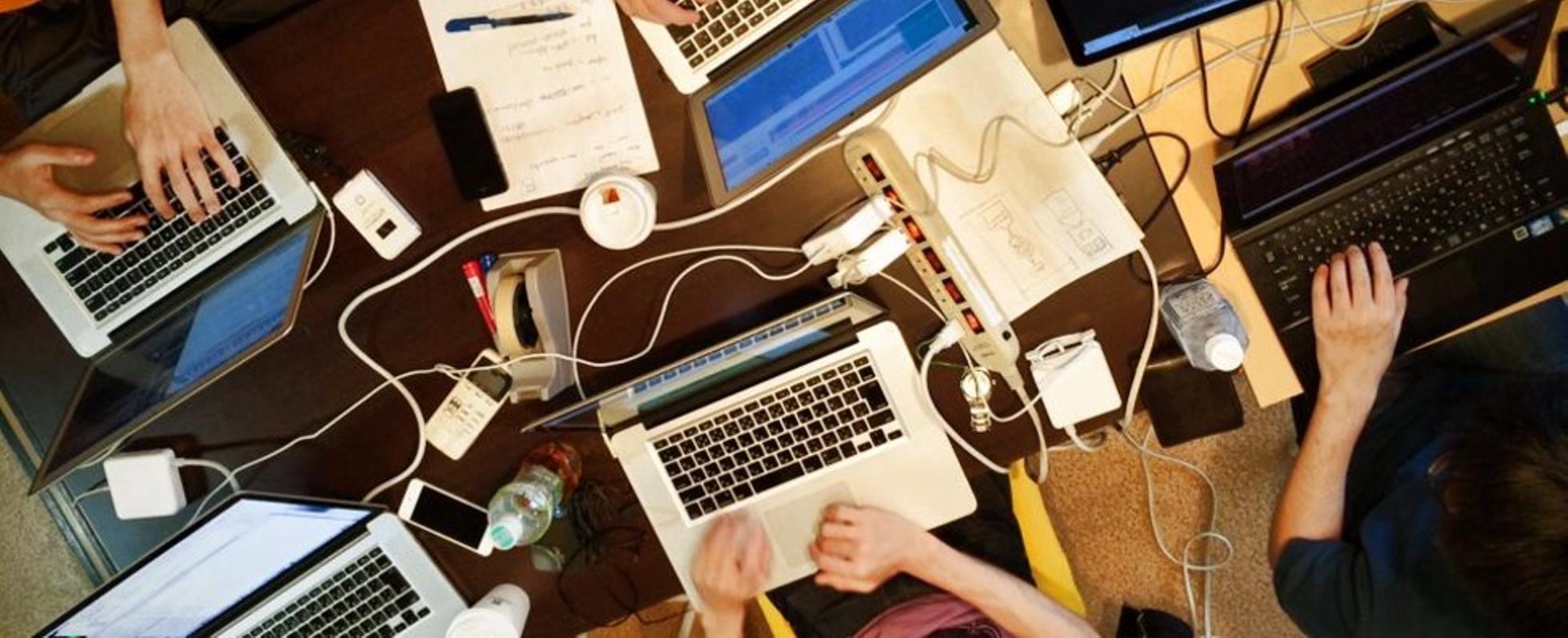 大きな窓が特徴の明るオフィスです。密なコミュニケーションで仕事をしています。