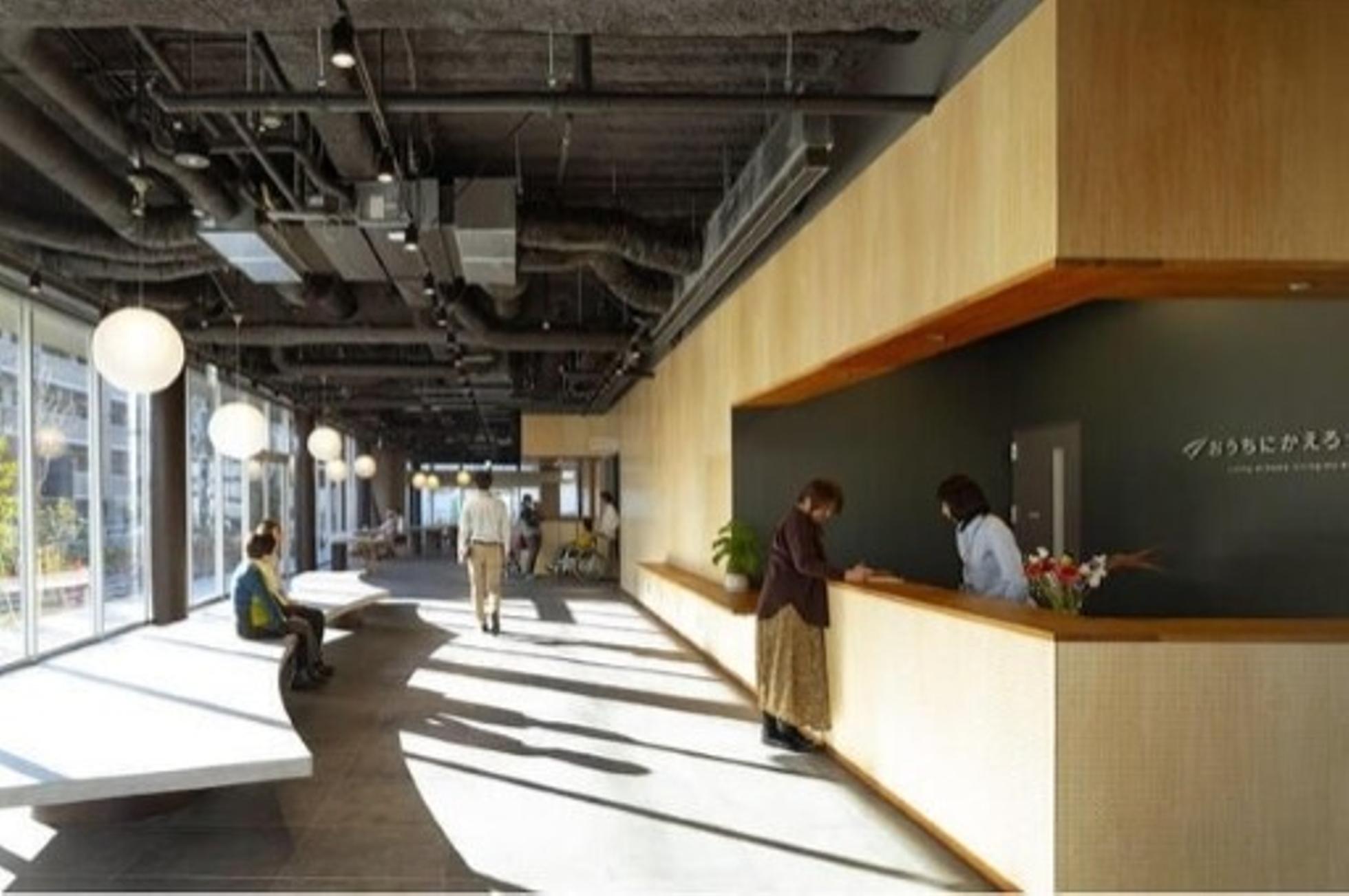 おうちにかえろう。病院の1階。外の名世界と病院内の世界とをつなぐようなデザインは、「病院」という閉鎖的なイメージを払拭し、患者様と地域とをつなぎます。患者様が過ごしやすいように、スタッフが働きやすいように、院内各所に様々な工夫と、想いが詰まっています。(撮影場所:おうちにかえろう。病院1階)