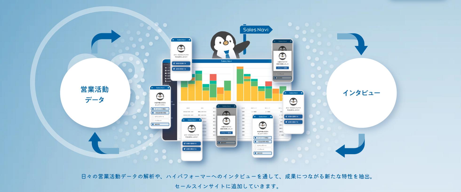 【展開している事業】 「セールスイネーブルメント事業(SaaS)」を展開しています。 セールスイネーブルメントとは、属人化しがちな営業の標準化を図ることで、成果のボトムアップを追求する取り組みのことです。 【サービス ( https://lp.salesnavi.co.jp/) 】 アメリカでは、セールスイネーブルメントは急速に普及していますが、日本ではまだ専業ベンダーが少ないため、認知度も低い状況です。そこでSales Naviでは、セールスイネーブルメント分野でのパイオニアになるべく、独自の営業標準化システムとしてSales Enablement Automationを開発しています。 営業を経験された皆さん、「営業」を初めてするとき、やり方がわからなくて悩んだことはありませんか? そうです、営業には「教科書」がありません。 営業には教科書がないからこそ、これまでごく限られた範囲でしか、ノウハウの言語化や体系化がなされていませんでした。 そこで私たちは、営業の教科書データとなる1,000項目以上の情報をAIコーチに学習させたアプリケーション(SaaS)を通じ、AIコーチが営業パーソンへ商談の前後に的確なアドバイスを提供することにより、営業活動をナビゲートするシステム「Sales Navi」を開発しています。 開発にあたっては、キーエンス・大手人材会社・大手保険会社・大手IT企業・大手不動産会社などの現役トップセールスが中心となり、トップセールスの「スキル」「 心構え」「習慣/管理」「 知識 」を2年以上かけて「見える化・形式知化」し、プロダクト設計に活かしました。 私たちは、「誰もが成果をあげることができる社会の創造」を目指し、 すべての営業職の道しるべとなります。