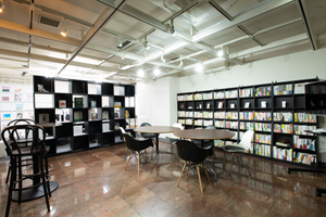 デザインやマーケティングの書籍がずらり。ビル全体がサンセリテのオフィスなので広々として働きやすい。