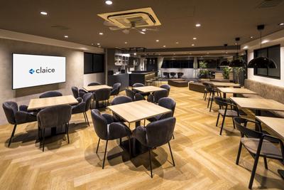 【社内の様子1】入り口を入ると目の前の壁にはクレイスのロゴか広がり、ブラウンの椅子では社員同士で雑談できるスペースになっています。