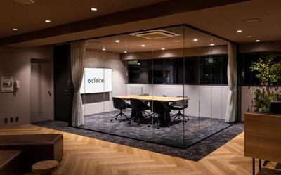 【社内の様子1】入り口を入ると目の前の壁にはクレイスのロゴか広がり、ブラウンの椅子では社員同士で雑談できるスペースになっています。
