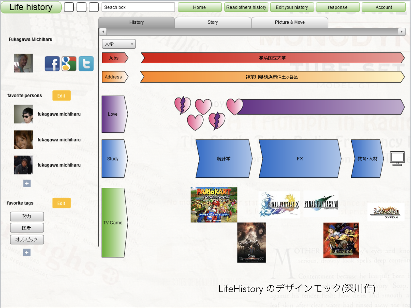 これはSNSのアイディアです。ユーザーは自分の経験したことを登録します。いつごろどんな経験をしたのか?例えば好きなスポーツ、音楽とのこと、練習したこと、他にはどんな趣味にハマっていたのか、登録・編集して経験を記録していきます。沢山の人生経験がアプリに蓄積されることで、ユーザーは自分の生き方について大きな舵を切るときに、他のユーザーの経験から自分の決断を後押しする何かを見つけられるかもしれない、経験を公開しながら誰かの人生を応援する、そんなアプリをイメージしました。
