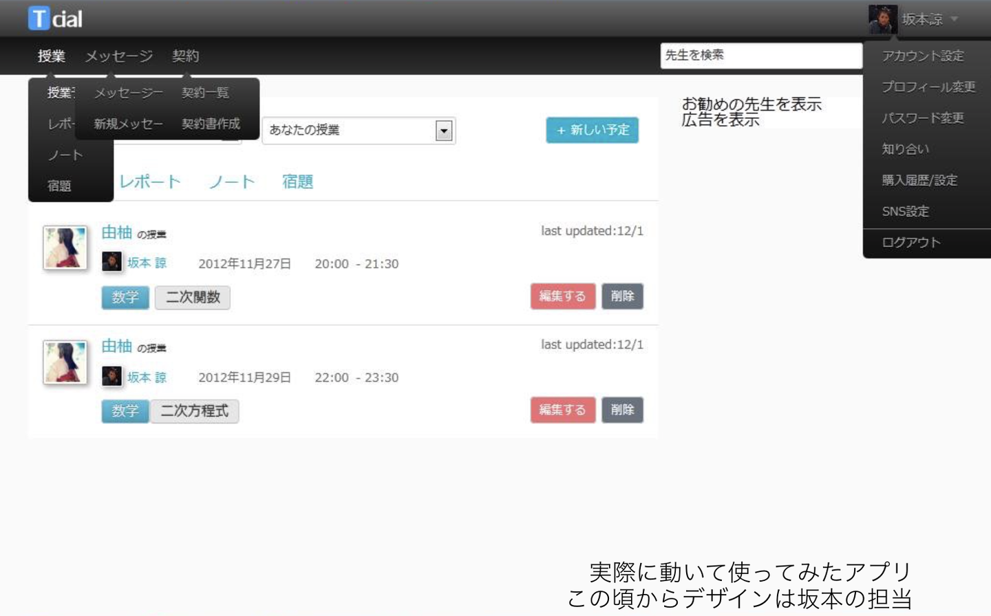 僕は10月にはゲーム会社を辞め、Tcial.comの運営にフルコミットするようになりました。アプリの開発は2013年1月頃までアプリ上で家庭教師の契約を締結できるようにするなどの機能を追加するため開発をしていました。しかしその後学習塾を立ち上げる話になり、開発は中断され、1年後にはサービスを終了することになります。実際に立ち上げた塾は、「個別指導塾Tcial」として今でも坂本が経営しています。