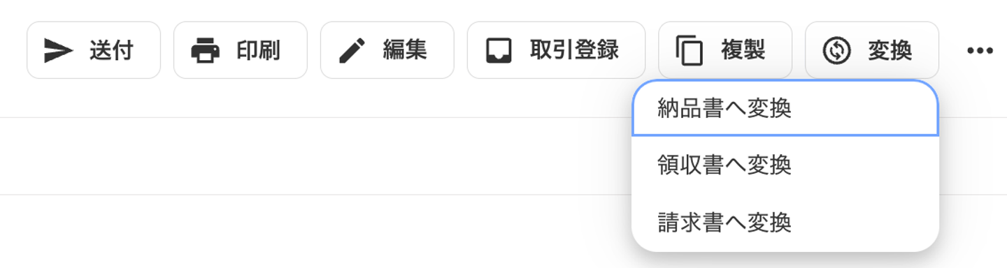 「納品書、領収書、請求書へ変換」というプルダウンが表示された。