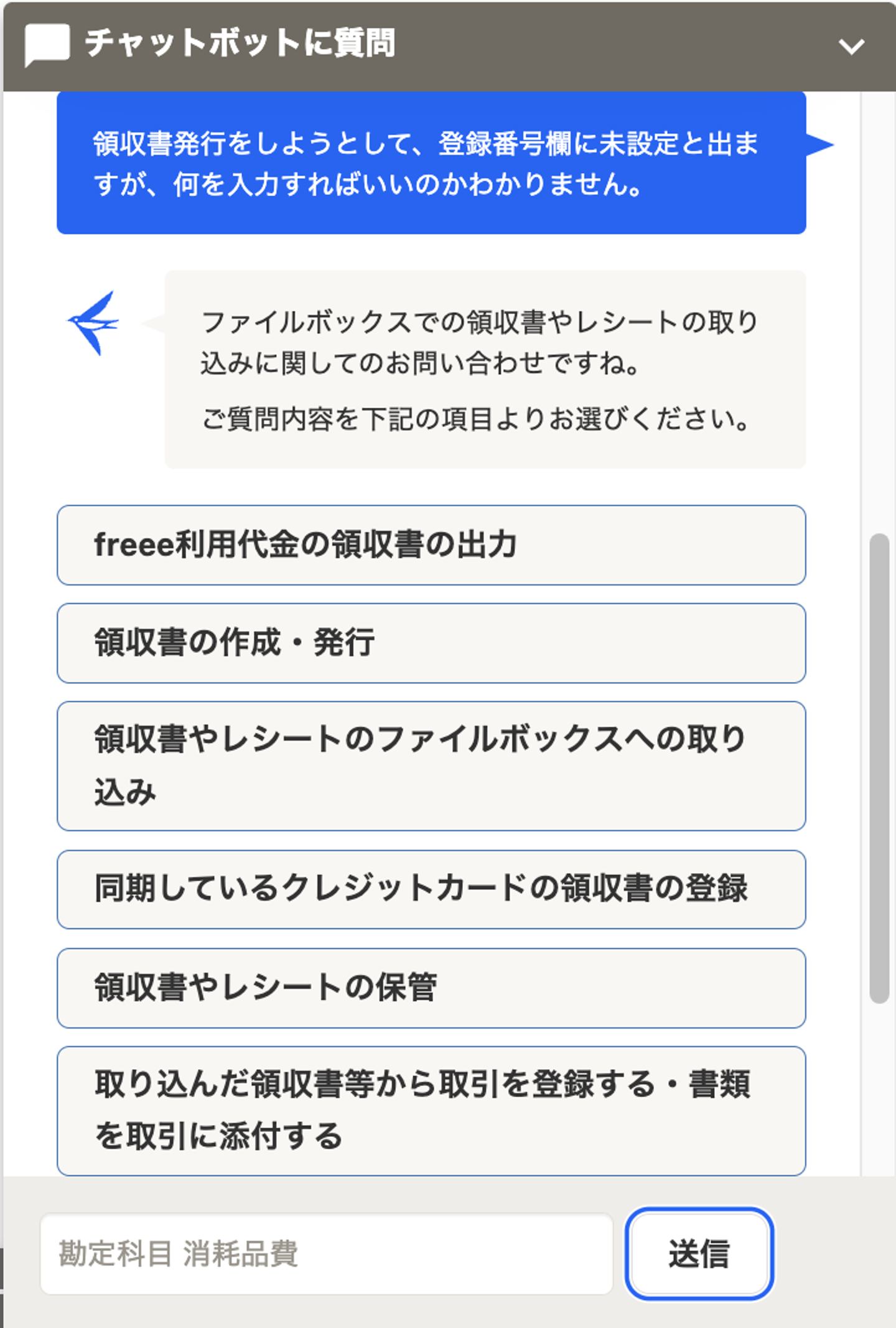 (後で答え、出るかな?と「請求書から領収書を発行するやり方を教えてください」と入力したが、出てきたオンラインヘルプの記述には、ジャスト該当する答えはなかった)